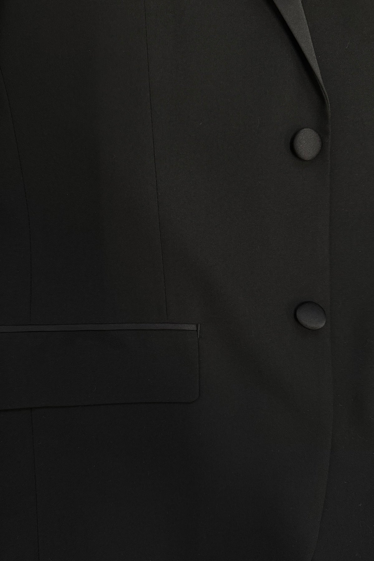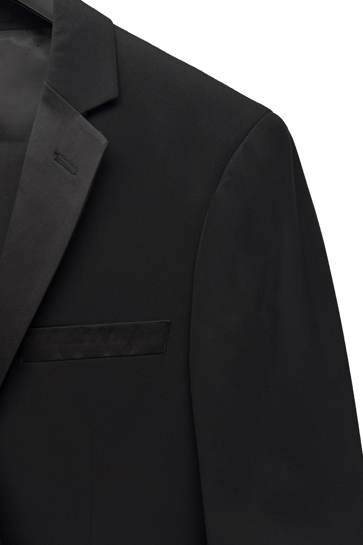 suit blazer, two-button tuxedo, satin notch lapels, satin chest pockets.