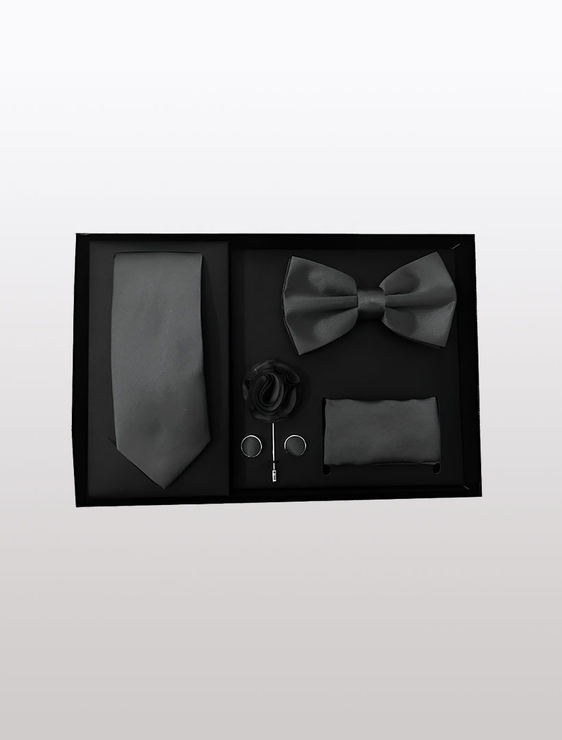 Gift Box Includes: Slim Fit Tie, Bow Tie, Pocket Square, Lapel Pin, and Cufflinks