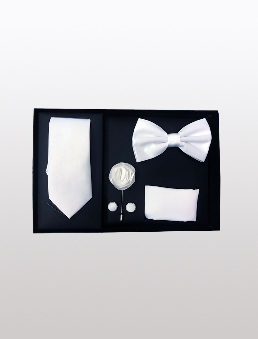 Gift Box Includes: Slim Fit Tie, Bow Tie, Pocket Square, Lapel Pin, and Cufflinks
